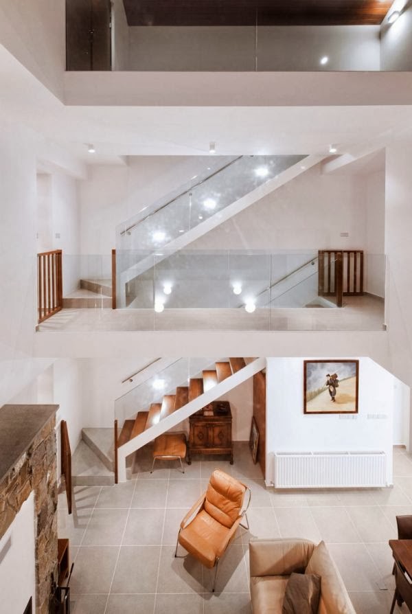 The entry is at the top of the hill, a quite interesting choice. The house is wrapped in local stone and wood and the shutters further emphasize the traditional allure. It does have, however, strategically-placed openings that let the light in and allows us to have a glimpse at the very different universe inside. All floors are bright and filled with light and they have a very open and airy feel.-Via